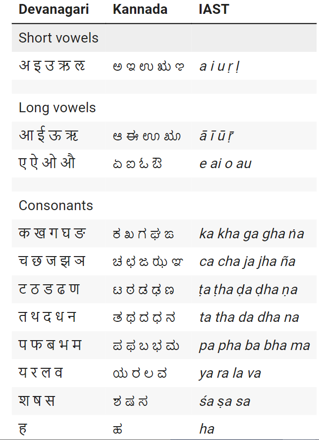 Notice that consonants in the above point do not contain the inherent vowel 'a'. This makes it easier to analyse prosody and makes IAST our preferred script. This is because IAST is a true alphabet (which means, each ‘letter’ represents only one phoneme, only one unit of sound), whereas Devanagari and other Indic scripts are alphasyllabaries (which is a fancy way of saying that each character contains one vowel and an arbitrary number of consonants; e.g., ऐ/ಐ/ai contains one vowel and no consonants, वा/ವಾ/vā contains a consonant v and a vowel ā, and क्र/ಕ್ರ/kra contains two consonants k and r, and a vowel a).