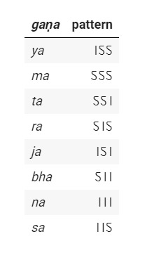 To analyse vārṇika metres, the standard method is to describe groups of three syllables, called gaṇa. Using combinatorics, we know that a total of 8 combinations of laghu and guru are possible for a group of three syllables. Thus, we have 8 distinct gaṇas: